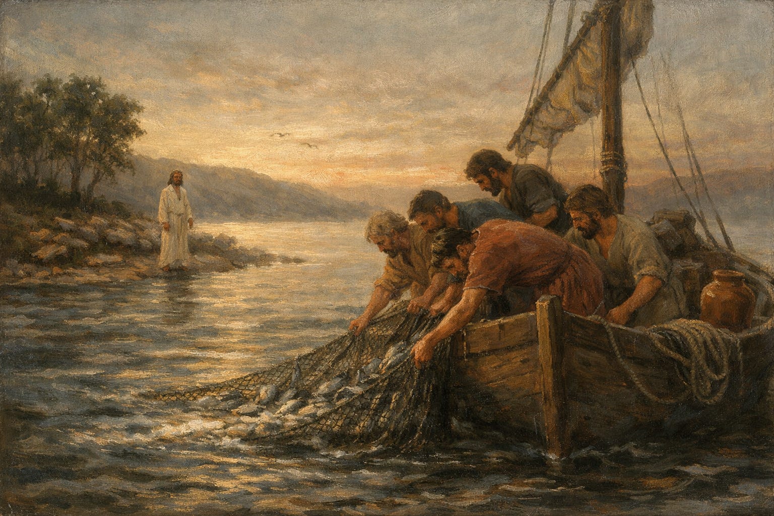 Then a voice from the shore spoke to them. Jesus told them to cast the net on the other side of the boat. It sounded simple, almost too simple. Still, they listened.